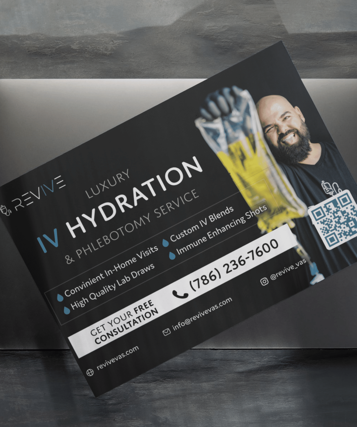 Revive, a mobile IV hydration and phlebotomy service in Miami, is an ongoing client of vivCreate. They came to us seeking a clean, modern flyer, a professional website, and other marketing materials that clearly communicate their services and brand identity. Our team designed a visually engaging flyer, developed a fully functional website, and created additional marketing assets to ensure a consistent, professional, and attention-grabbing brand presence.